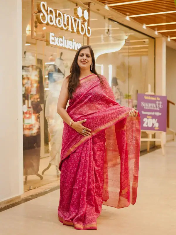The smooth, lustrous fabric flows beautifully, while the intricate block motifs add a touch of timeless heritage. Perfect for festive occasions, weddings, and elegant gatherings, this saree is where luxury meets tradition.